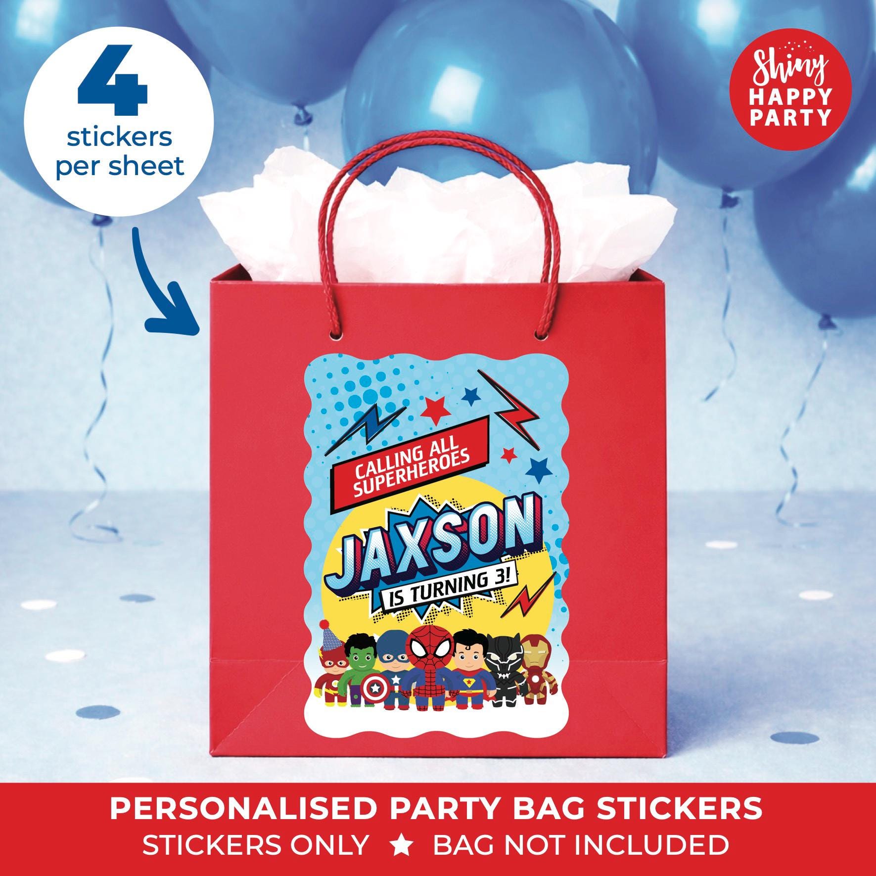 • Stickers are designed to fit most standard party boxes and bags