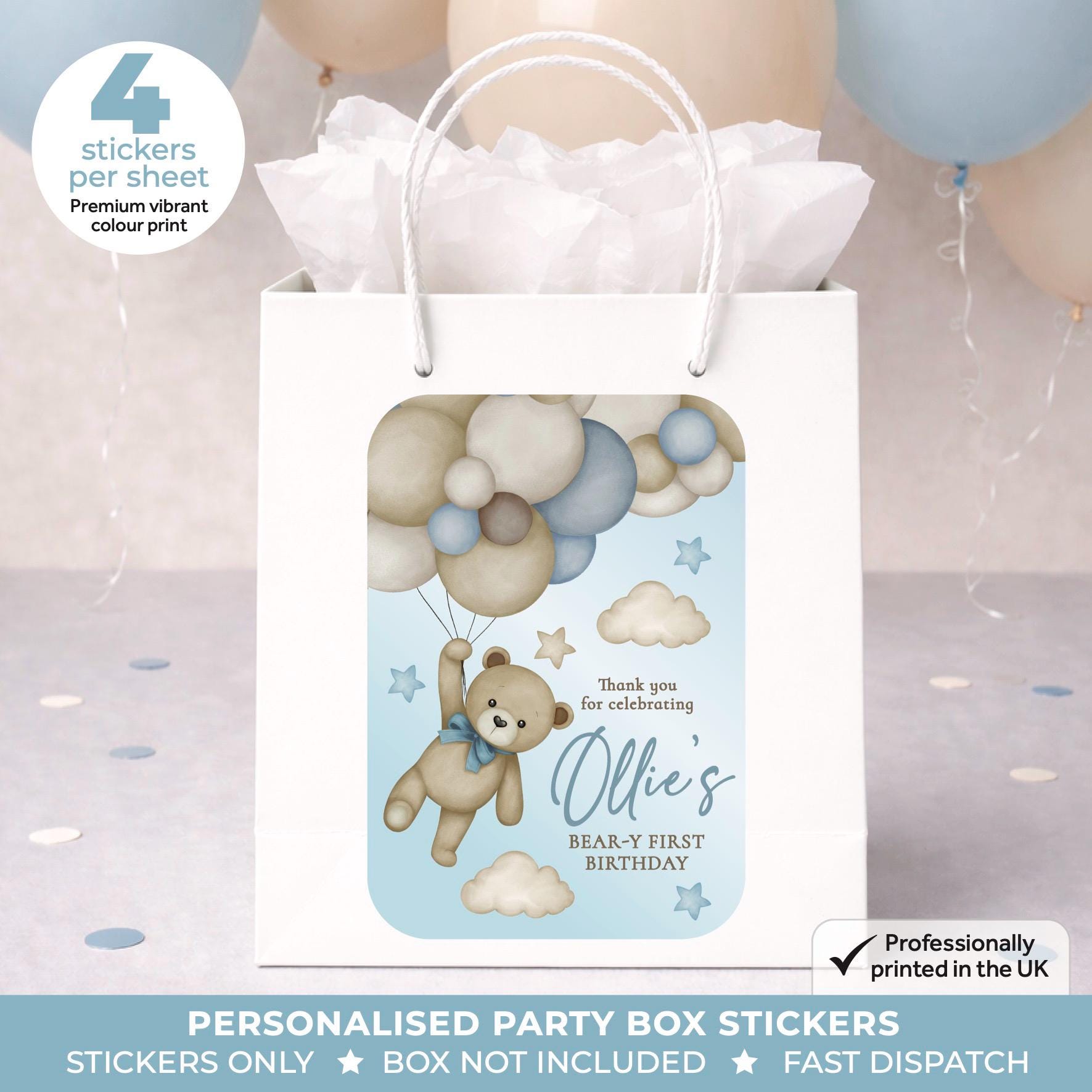 • Stickers are designed to fit most standard party boxes and bags