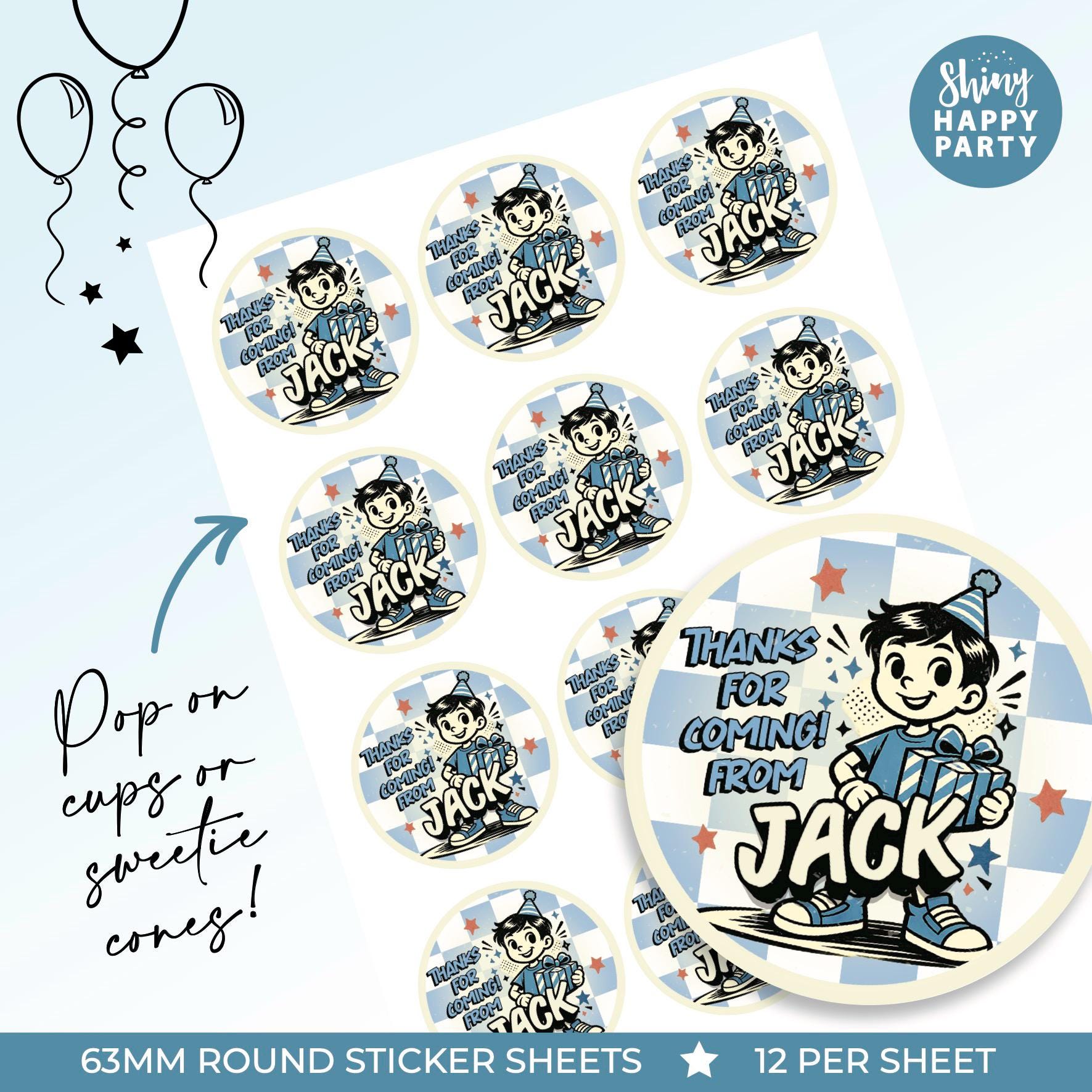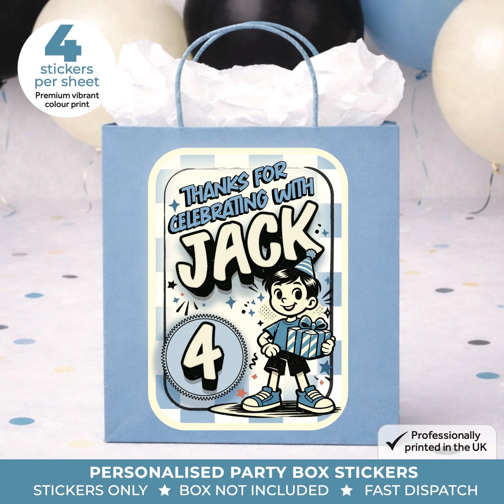 • Stickers are designed to fit most standard party boxes and bags